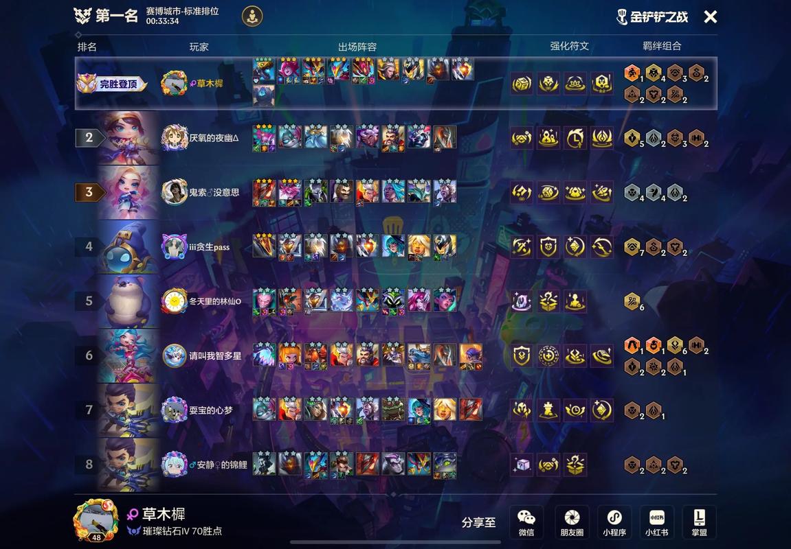 阵容组成:刀妹、偷男、狼人、慎、月男、寒冰、千珏、猫咪。羁绊搭配:3月神、2宗师、4猎人、2斗士,以及2天神、1忍者、2明昼、2秘术的组合。核心棋子:厄斐琉斯。作为月神和猎人的核心,厄斐琉斯在金铲铲中追三星极为容易,搭配月神羁绊和猎人羁绊,输出能力极强。