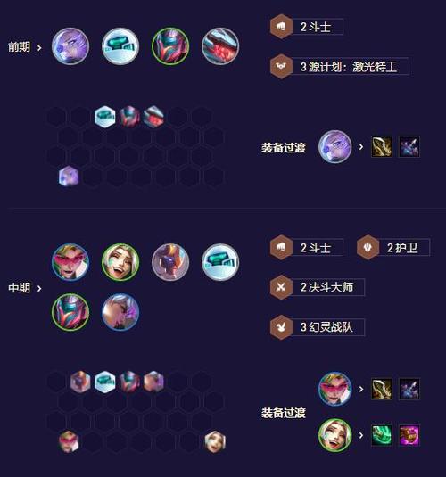 盖伦:单顶前排,吸引火力。稻草人与螃蟹:合体站同一边,快速启动和控制对方主C。铁男:位置灵活,只要能放出大招即可。女枪与沙弥拉:沉底左右两边,保护后排输出。稻草人与螃蟹:左右站位,根据对方C位位置灵活调整。搜牌节奏 前期:尽量用强势棋子与羁绊打工,保证2星打工棋子,稳定血量。