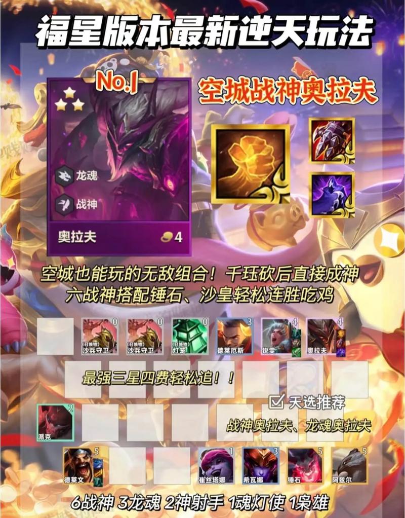 首选天选:希瓦娜。希瓦娜作为斗士和龙魂的双重羁绊英雄,是这套阵容的核心输出点。她的技能可以造成范围伤害,并附带额外的魔法伤害,非常适合作为主C。备选天选:斯维因(斗士天选)和新春使者(龙魂天选)。斯维因可以提供额外的控制效果,而新春使者则可以增加团队的爆发能力。