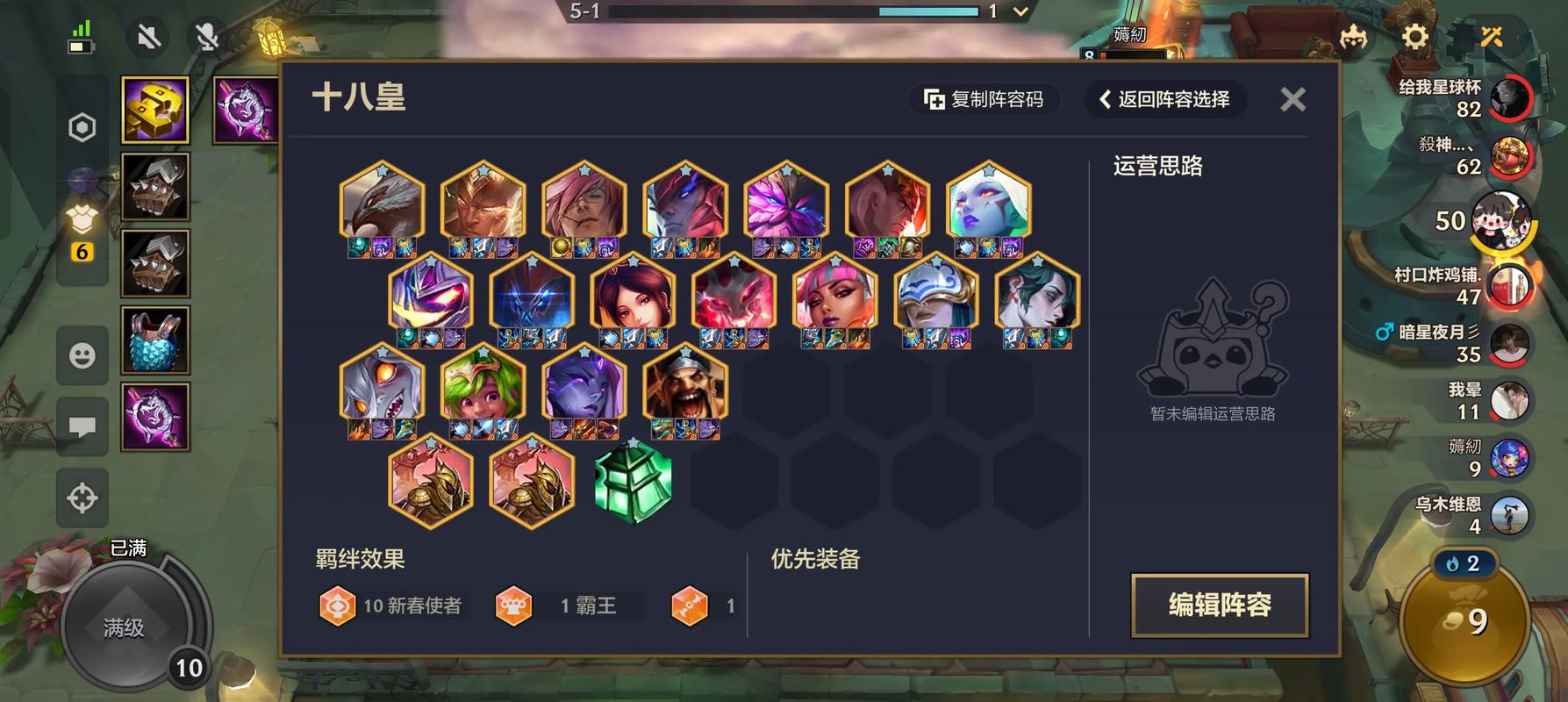 运营思路:开局优先抢金铲铲,优先合成皇子的魔法师转职。2-1拉4人口,2-5拉5人口。如果5人口时盖伦还未2星,可小搜十几金币寻找2星盖伦。前期运营以盖伦、孙悟空、伊莉丝、皇子(三国猛将天选)为基础阵容,输出装给皇子,肉装给盖伦。