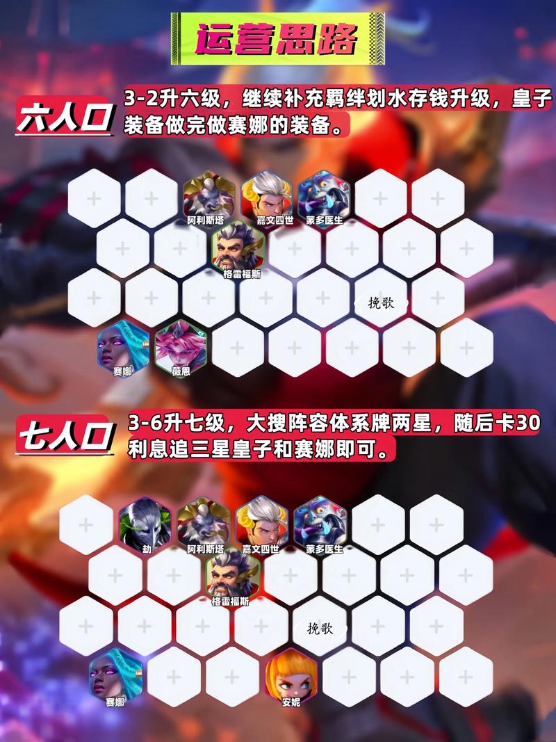 〖Two〗、开局:优先抢金铲铲,以合成皇子的魔法师转职为目标。前期:2-1拉4人口,2-5拉5人口。如果5人口时盖伦还没2星,可以小搜十几块找2星盖伦。随后拉6人口,攒40块钱,用利息慢D天选三国皇子,并将皇子和盖伦追到3星。中期:6人口时找到三星皇子和三星盖伦后,即可攒钱拉人口。
