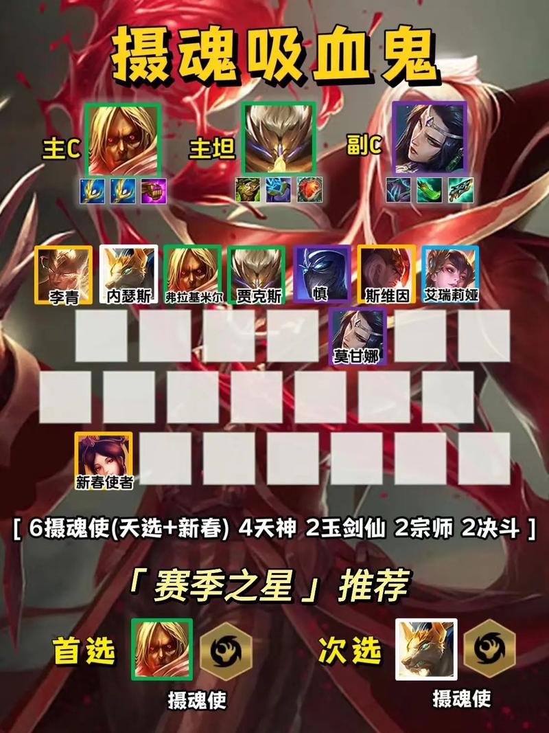 〖Two〗、装备分配:优先合成无尽轻语给莎弥拉,同时为腕豪准备三件套。后期策略:依靠琴女打音符刷取五费卡,或利用其他新春使者提升阵容强度。总结:以上三种阵容均需玩家具备一定的运营能力和对游戏节奏的把握,通过合理的装备分配和英雄选取,可以发挥出各自阵容的最大潜力,助力玩家在金铲铲之战中顺利上分。