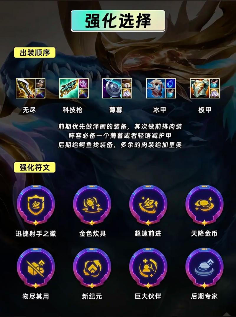 阵容组成与核心羁绊阵容核心为9金鳞龙,成员包括:霞、佐伊、亚索、狗熊、凯隐、剑魔、乌鸦、艾达丝。金鳞龙羁绊可提供特殊装备(如德莱文之斧、投机者之刃),通过装备效果快速积累经济优势,后期依赖高费卡(佐伊、亚索)的强势技能终结比赛。