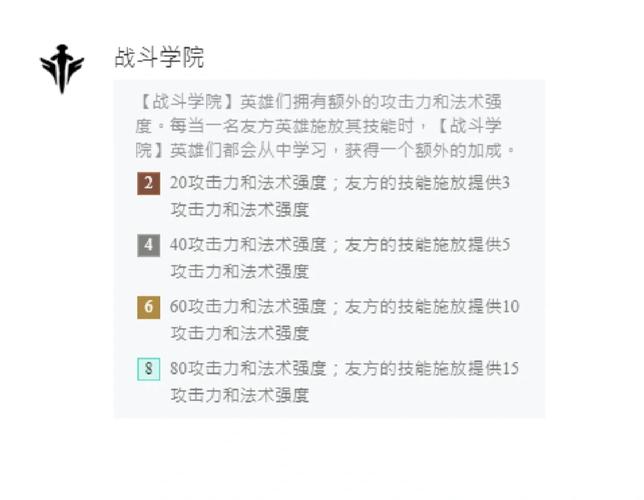 〖One〗、金铲铲之战双城之战羁绊效果一览如下:战斗学院:效果:获得额外的攻击和法强。战斗学院的英雄使用技能后,队友也会获得额外的加成效果。黑魔法师:效果:友方获得法术强度加成,加成效果随等级变化。黑魔法师还会获得额外的法术加成。刺客:效果:刺客英雄使用技能具有暴击效果,并额外获得暴击及暴击伤害加成。