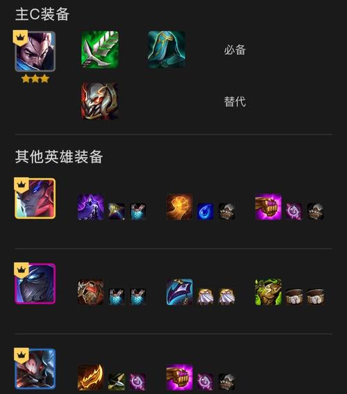 〖Five〗、主C薇古丝:蓝霸服+珠光护手+巨人捕手/大天使之杖。薇古丝作为输出核心,蓝霸服保证技能释放频率,珠光护手提升技能伤害,巨人捕手或大天使之杖则根据对手阵容坦度选取。主坦墨菲特:狂徒铠甲/荆棘之甲/石像鬼石板甲/巨龙之爪/救赎。墨菲特作为前排坦克,装备选取以提升坦度和生存能力为主。