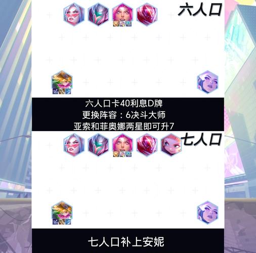 开局选秀:优先抢宝剑,其次水滴或大棒。前期过渡:2-1升4,2-5升5,使用强力打工阵容,如2/3AI+3混沌+2斗士。中期节奏:3-2升6人口,小搜卡找到薇恩与乐芙兰,形成4AI+2决斗+2斗士/2福牛。根据连胜情况3-5或4-1升7人口。后期成型:4-5或5-1升8人口搜薇恩三星,添加盖伦增加全员护甲。