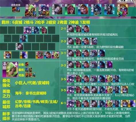 阵容搭配 皮城枪阵容主要以皮尔特沃夫羁绊为核心,搭配其他能够提升输出和生存能力的英雄。主C为泽丽,副C为厄加特和赛娜,主T为瑟庄妮。这样的搭配能够确保阵容既有足够的输出,又有一定的坦度。装备搭配 主C泽丽:核心装备:羊刀、无尽。
