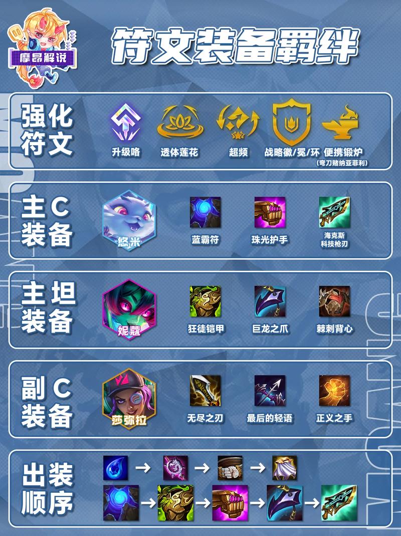 〖One〗、装备:主C悠米必备蓝霸服和珠光护手(或巨人捕手,有“猫之精准”则无需珠光护手),副C娑娜必备救赎,主坦尼菈必备离子火花和莫雷洛秘典,其余装备根据实际情况选取。运营攻略 开局与装备:优先拿女神泪,用于合成蓝霸服和救赎。2阶段尽量走连胜,避免连败。D卡节奏:这是一套D卡流阵容,核心卡牌是3费卡。