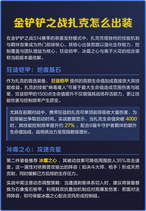 扎克在《金铲铲之战》中属于炼金科技与格斗家羁绊的角色,通常不作为主要的坦克使用。但如果要将扎克设为坦克角色,则建议装备搭配包括狂徒铠甲、龙牙和反甲,这样可以显著提升他的生存能力,并增强控制效果。狂徒铠甲可以提供额外的生命值,增加扎克的生存时间,即使在受到大量伤害后也能保持战斗能力。