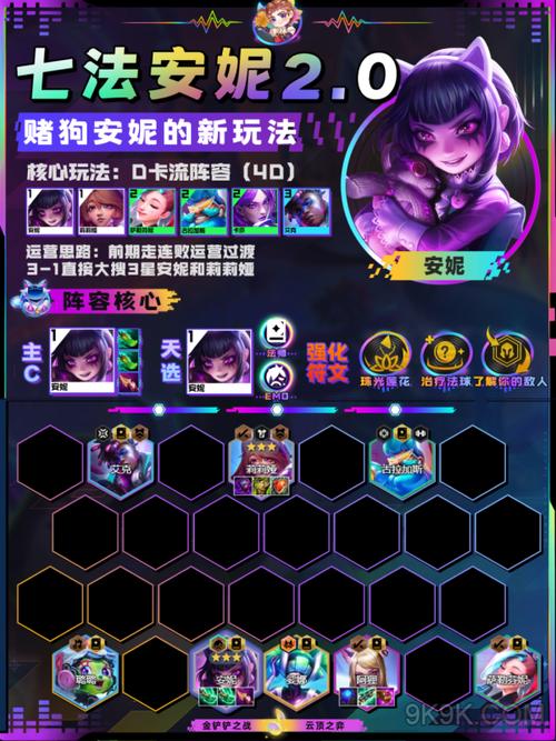 〖One〗、《金铲铲之战》S14超频安妮阵容玩法及推荐 阵容构成 核心成员:安妮、妮蔻、悠米、莎弥拉、盖伦、扎克、艾克、纳亚菲利、奈德丽。羁绊组合:5超频战士、3战略分析师、3街头恶魔。这一组合能够发挥各英雄的技能优势,形成强大的团队战斗力。