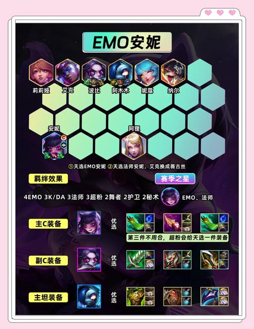〖Two〗、金铲铲之战EMO安妮阵容主要由安妮、露露(×2,注意这里露露出现了两次,但可能是信息冗余或笔误,实际搭配中露露只需一个)、酒桶、阿木木、艾克、薇古丝、锤石、娑娜、俄洛依组成。阵容羁绊 该阵容拥有4EMO、5法师、2护卫和2格斗家的羁绊组合,这样的搭配能够大幅提升阵容的输出和控制能力。