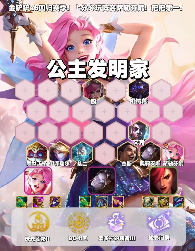 推荐的阵容为:杰斯、迦娜、奥利安娜、萨勒芬妮、黑默丁格、塔里克、基兰、伊泽瑞尔。此阵容由5发明家、2学者、2极客、3白法、2精密、2名流组成。如能转职,则可进一步强化发明家羁绊至7人。8人口成型的阵容中,除了斗枪之外,几乎都包含这套羁绊。