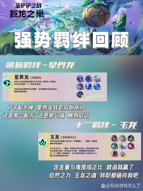 〖Two〗、幽影龙:削双抗,敌方前排的噩梦,偏功能性。玉龙:经典召唤物体系,需要邻格站位享受收益。金鳞龙:偏娱乐向,提供额外金币和战力。幻境龙:翻版变异战士,限时返场旧羁绊。风暴龙:输出型羁绊,需要挺过9秒才触发。经典羁绊 刺客:经久不衰,新赛季可能复辟荣光。斗士:回归经典,包括塔姆等角色。