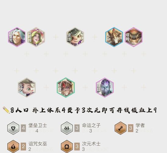 一费卡:奎桑提、莉莉娅二费卡:盖伦、萨勒芬妮三费卡:莫德凯撒、艾克四费卡:阿狸、布里茨五费卡:娑娜主要羁绊:6秘术护卫3法师3KDA装备推荐:主C阿狸:蓝buff或朔极之矛必备,第二件优先科技枪,第三件法系输出装(如纳什之牙)。主坦布里茨:离子火花和通用肉装(如狂徒、坚定之心、冠冕)。