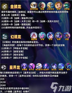 如快乐羁绊(开技能时放烟花,造成固定魔法伤害)、玉龙羁绊(召唤玉龙雕像,为周围队友提供生命值回复和攻速加成)、怒翼龙羁绊(高攻速,开技能时进入狂怒状态)、幽影龙羁绊(造成伤害时减少对方双抗)等,各具特色,为游戏增添了更多玩法和策略。