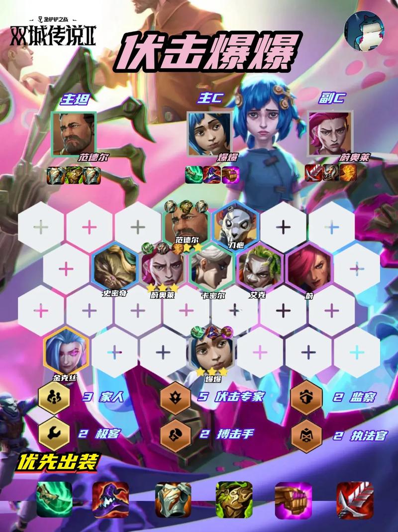 阵容搭配 棋子组成:楚雨荨(2费)、乌鸦(2费)、狼人(2费)、男刀(2费)、婕拉(2费)、大嘴(2费,主C)、璐璐(2费)。这套阵容的核心在于不激活任何羁绊,依赖“卓尔不群”海克斯效果来提升全体棋子的属性。海克斯推荐:优选羽量级、潘多拉、直击弱点、二进制备选。其中,卓尔不群是核心海克斯,必须拿到。