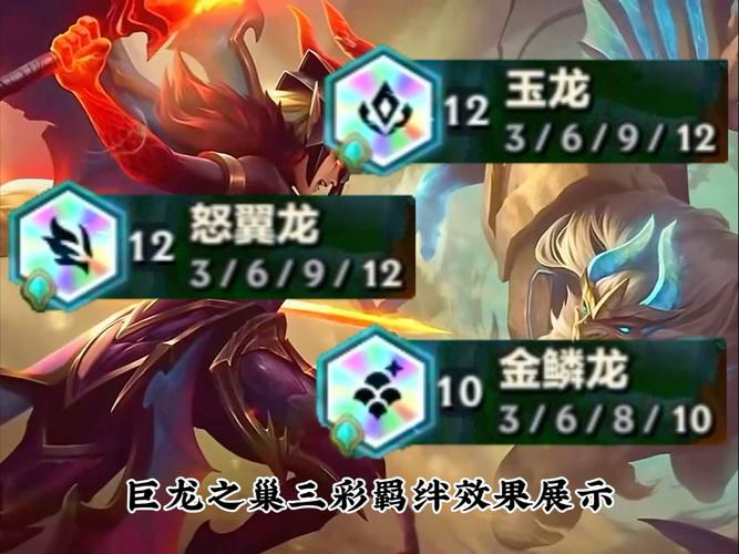 〖One〗、金铲铲之战巨龙之巢羁绊一览:星界龙(3/6/9):每第5次商店刷新有额外几率出现星界龙英雄,并提供星界龙法球。队伍获得额外法术强度,法术强度和法球价值随羁绊层级提升。怒翼龙(3/6/9):将法力值转化为怒气值,每次攻击生成15怒气。施放技能后进入狂怒状态,持续4秒,提供攻击速度和全能吸血,随羁绊层级提升。