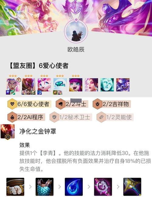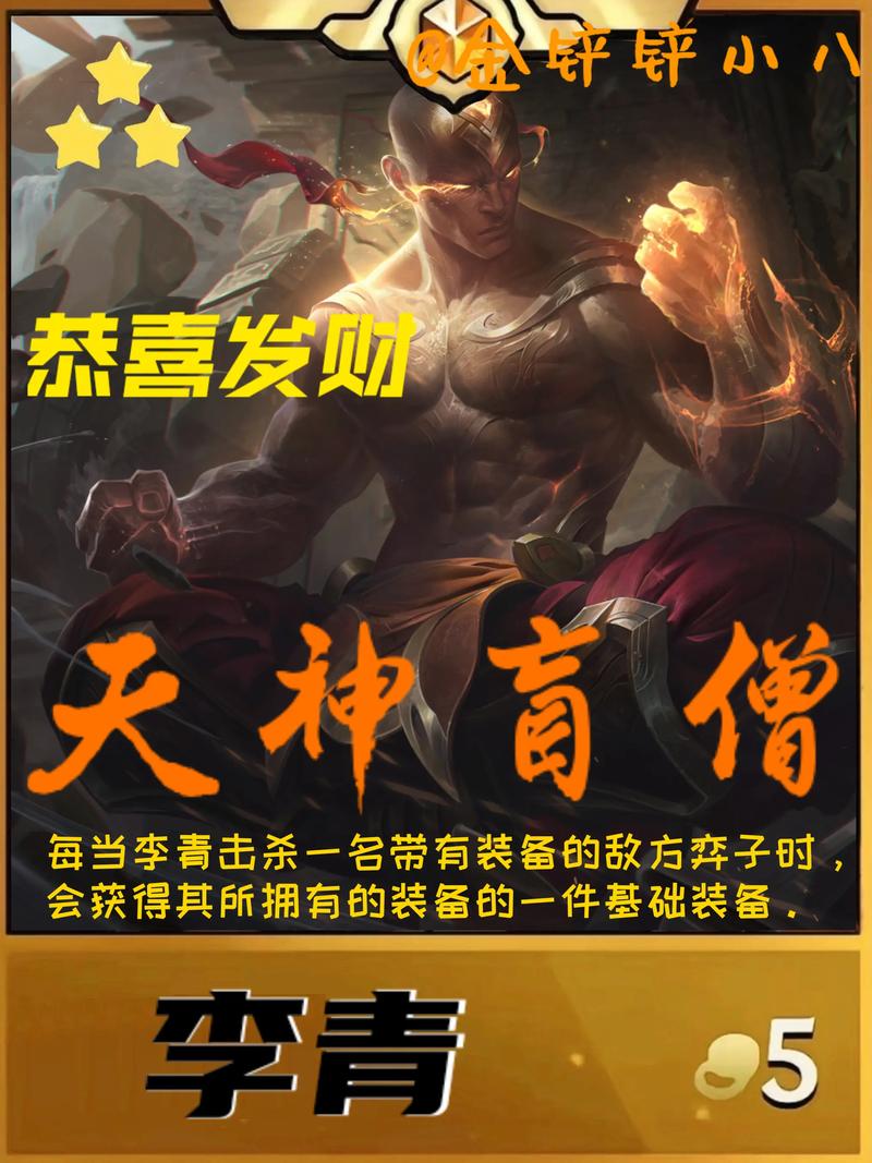 〖Two〗、核心英雄:天神李青(盲僧)其他英雄:猴子、刀妹、慎、狗头、武器、千珏、霞、天使(裁决天选)、永恩这个阵容以天神李青为核心,搭配其他具有强大控制和输出能力的英雄,形成多羁绊的强力组合。羁绊组成 6天神:提供额外的攻击力和法术强度加成,增强阵容的整体输出能力。