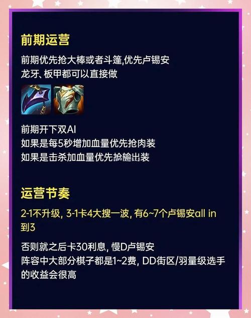 〖Three〗、金铲铲之战S5版本策略是眼泪开,掌握关键阵容和海克斯是上分的关键。白魔塞纳阵容:这是一个以塞纳为核心的阵容,推荐连胜开局,装备上羊刀、无尽和巨杀/轻语是最佳选取。阵容组成为4白魔+3名流+3约+2黑魔,关键点是确保塞纳等核心英雄的上场,同时海克斯强化中的3费之力能显著提高胜率。
