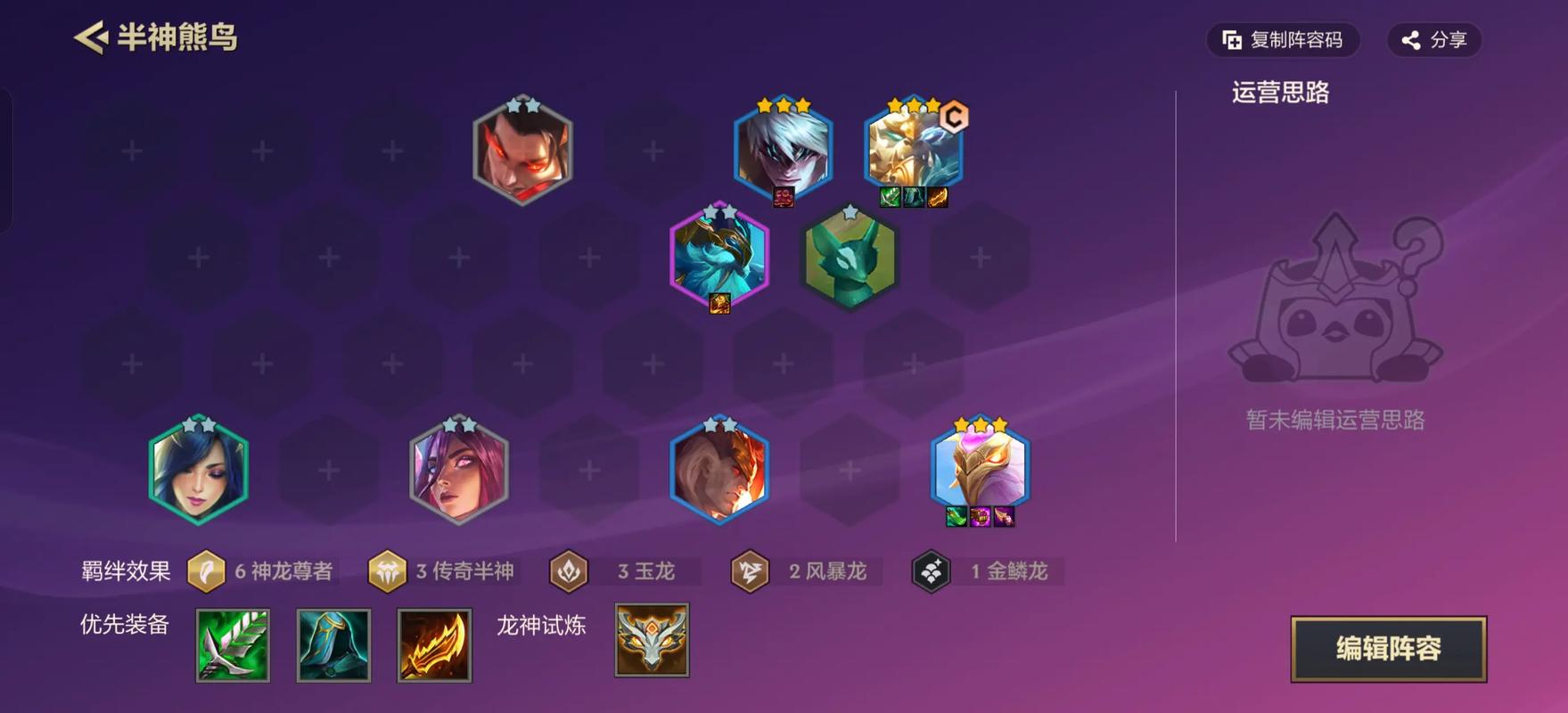 〖One〗、T0级上分阵容半神狗熊(神龙尊者体系)核心组成:狗熊(主C)+奥恩+冰鸟+盲僧+卡尔玛+亚索 关键羁绊:6神龙尊者+3传奇半神 装备优先级:狗熊必备羊刀、水银、饮血剑;盲僧带肉装抗伤。运营思路:3-7阶段D出2星狗熊稳血,4-5上8追三星,冰女和盲僧的减抗效果可替代离子火花。测试中能击败三星四费卡,强度极高。