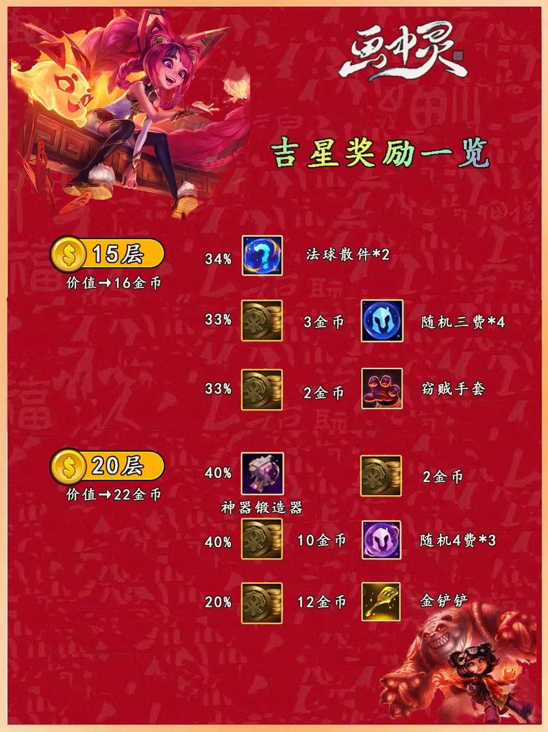 吉运:金币翻倍至2枚,有50%的概率获得金币或2费卡牌。3吉运:奖励包括4枚金币、两个2费卡牌或一个2费和3费组合,中奖概率分别为40%、30%、30%。6吉运:提供7枚金币、1枚金币加3个2费卡牌、或1枚金币加2个3费卡牌的机会,中奖率大致相同。