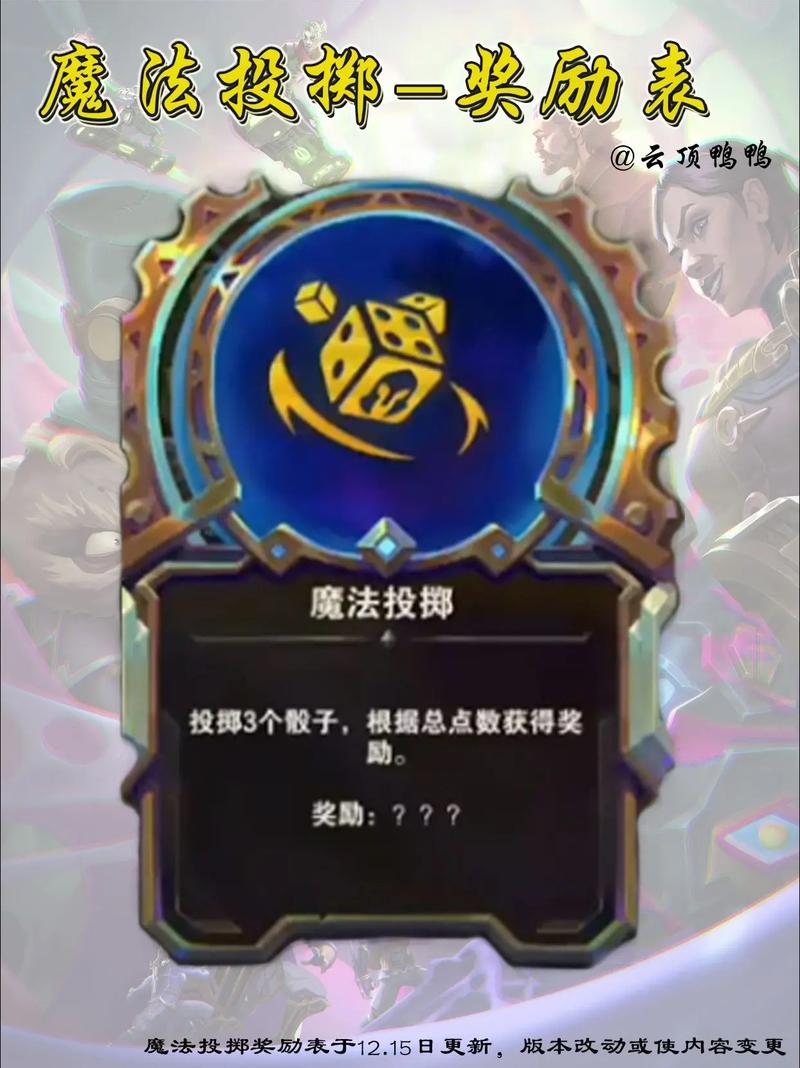 当投掷的总点数为626时,玩家将获得一份特殊的奖励——小金蛋。小金蛋可能包含游戏内的稀有道具或资源,具体奖励内容可能因游戏更新而有所变化。海克斯强化符文刷新概率:在进行魔法投掷时,除了获得上述奖励外,还有可能影响海克斯强化符文的刷新概率。
