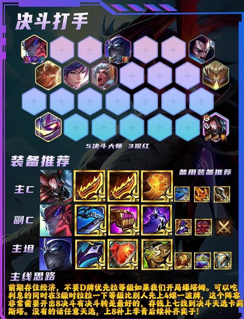 同时,注意站位和装备分配,以应对不同的对手。海克斯选取赌狗阵容建议多拿D牌类的海克斯,如DD街区、D到上头等,有助于前期找随从拿连胜。中后期阵容则更注重羁绊相关的海克斯,如白魔相关、黑魔相关、格斗炼金相关等,以提升阵容的整体实力。