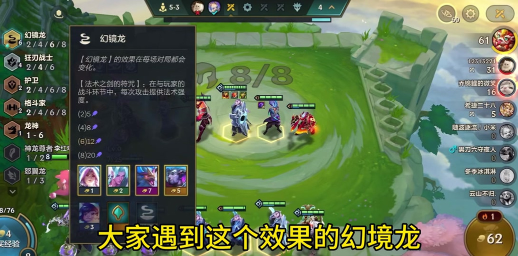 〖Two〗、金铲铲之战s5金龙幻镜迭嘉阵容玩法攻略:阵容组成与站位 阵容组成:迭嘉、艾达丝、努努、亚索、索拉卡、永恩、蕾欧娜。羁绊组成:8幻镜龙、1唤星者、3金鳞龙、2护卫、2狂刃战士、2龙神。站位:艾达丝单顶前排,其他人沉底站位。
