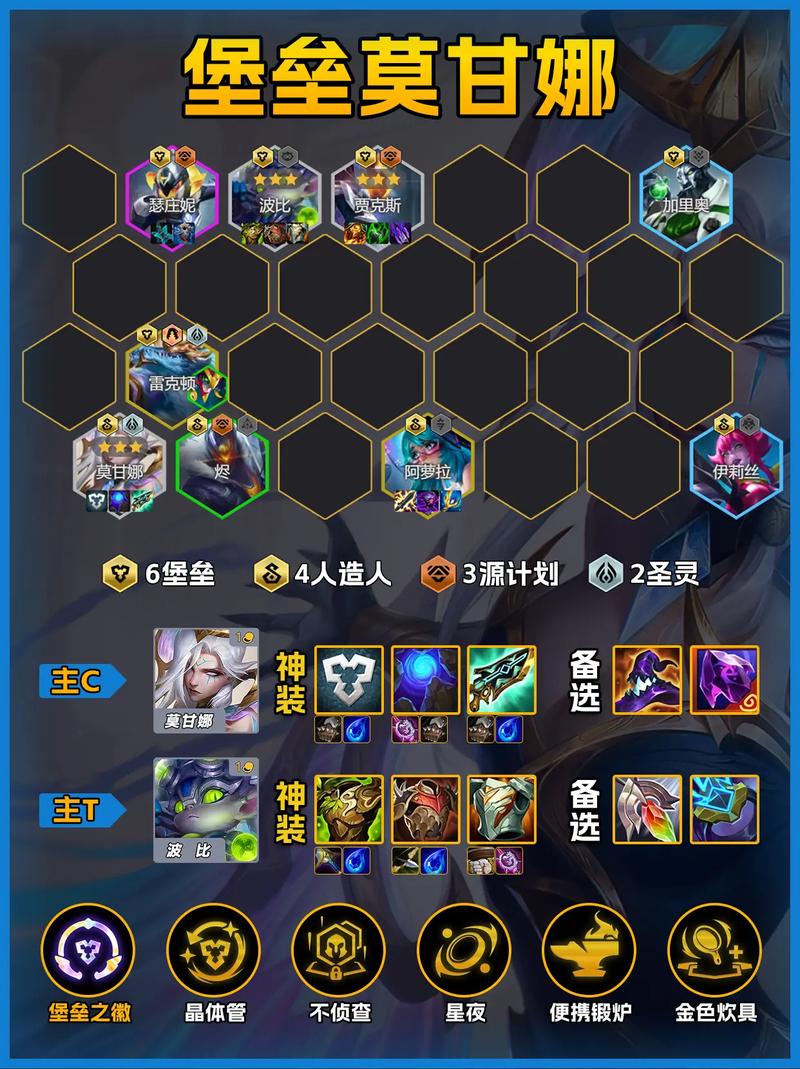 T0级:先知之徽(提升先知羁绊效果)、星夜(提升全体回蓝速度)、硬化护盾(提升全体护甲)T1级:珠光莲花(提升技能暴击伤害)、狩猎律动(提供吸血效果)、潘多拉的装备(随机变换装备)运营攻略 在运营方面,建议前期尽快凑齐3先知羁绊,以加快莫甘娜的技能释放频率。