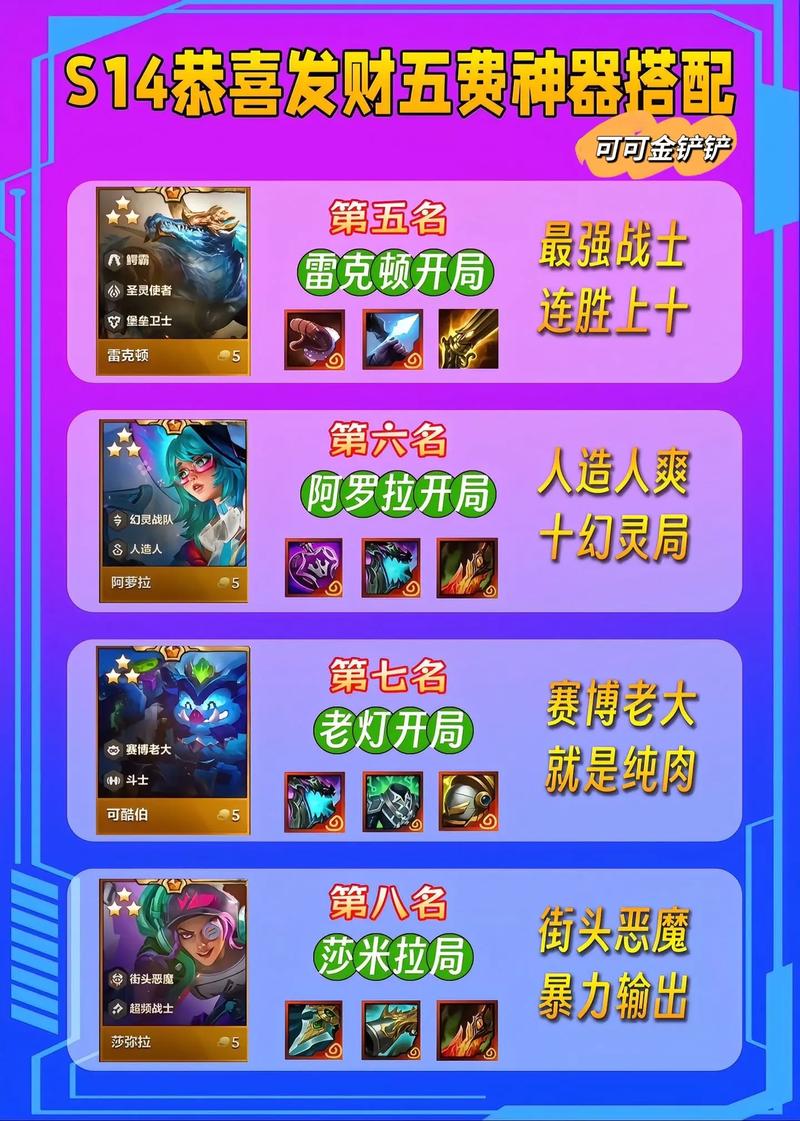 〖Four〗、综上所述,扎克、螃蟹、佛耶戈、盖伦和鳄鱼是金铲铲之战S14恭喜发财模式中开局最强的五张五费卡。他们各自具备独特的特点和策略价值,可以根据你的游戏风格和阵容需求来选取使用。