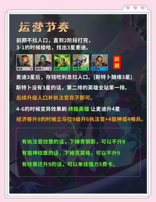 〖One〗、主坦斯特卜:装备推荐为板甲、狂徒、冕卫。斯特卜作为麦迪追三的顺带选取,若低费斗士未三星,肉装可考虑给予2星或三星瑟提(带控制),后续再考虑给2星蜘蛛。副C凯特琳(女警):装备推荐为红buff/鬼书、青龙刀、无尽。凯特琳的装备选取可根据实际情况灵活调整,以提供额外的输出和控制能力。