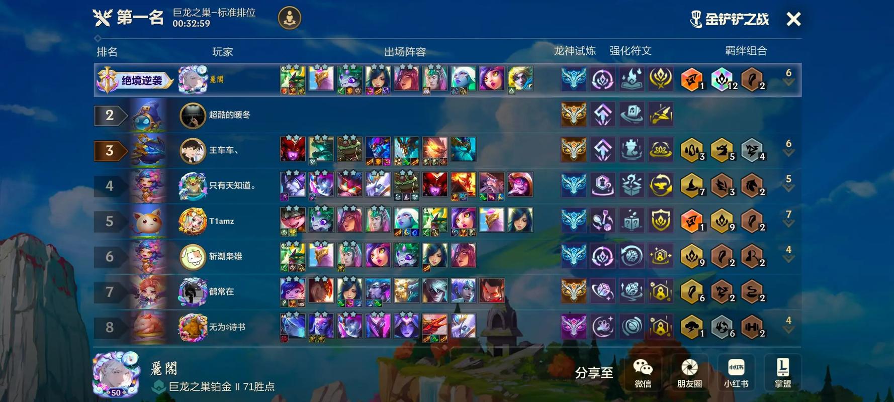 〖Five〗、驯龙高手阵容 核心思路:利用驯龙大师和龙族的羁绊,快速召唤出强大的龙魂,形成强大的战斗力。关键英雄:赛娜、艾希、崔丝塔娜等驯龙大师,以及诺姆希等龙族英雄。装备推荐:优先给核心输出英雄如赛娜或崔丝塔娜配备攻速和攻击力装备,如无尽之刃、最后的轻语等。