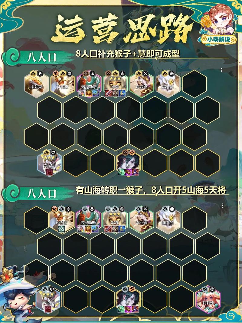 莫甘娜:提供群体控制技能,是团战中的关键。妮蔻:敏捷的输出单位,能迅速攻破敌人的后排。莉莉娅:辅助魔法使,可以增强队伍的持续战斗能力。