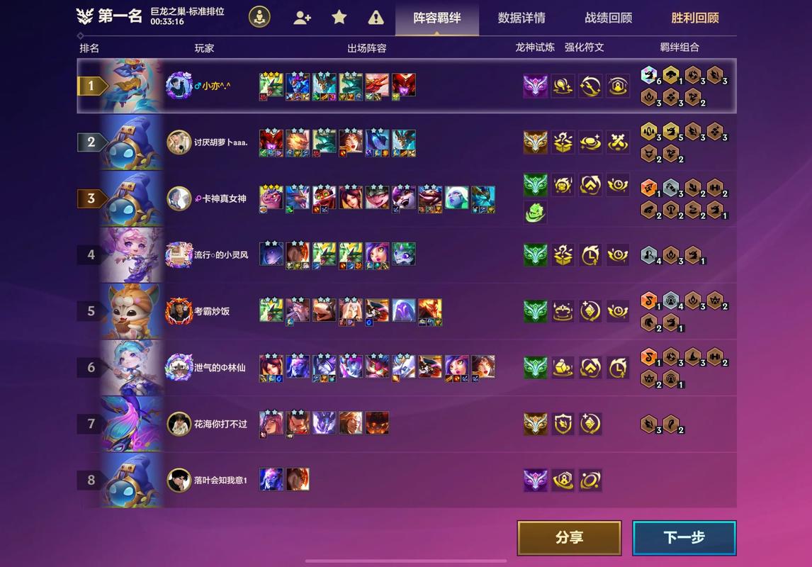 〖Two〗、- T0级羁绊包括神龙尊者、传奇半神和换形。由于缺乏打肉的棋子,血牛型英雄变得非常流行。风暴龙提供强大的群体控制,但棋子间缺乏相互支持。- T0.5羁绊如幽冥龙,特别强力,尤其是搭配赛芬和派克这样的英雄。- T1级羁绊如法师,具有强大的双重施法能力,但需要找到能承担主要输出角色的英雄。