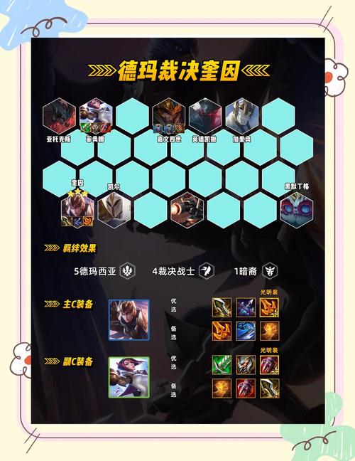 〖Two〗、金铲铲之战S13战地医生专属阵容的搭配方法如下:阵容构成 核心棋子:图奇(老鼠)、蒙多医生其他棋子:凯特琳(女警)、伊莉丝(蜘蛛)、厄加特、努努和威朗普、盖伦、婕拉海克斯强化推荐 优选:物竞天择、克隆设施、月光在有“月光”海克斯时,婕拉可以成为副C,携带青龙刀等装备。
