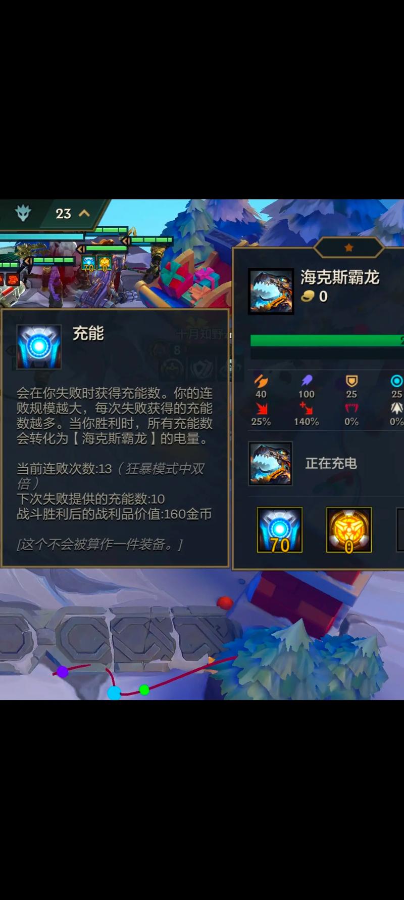 〖Five〗、当玩家凑齐3皮城羁绊后,就可以在棋盘上召唤出海克斯霸王龙,它具有100点基础生命值。玩家每输掉一次对局,霸王龙就会获得一层充能。连败次数越多,充能层数也会相应增加。当玩家获胜时,会释放充能并获得等于充能层数的能量。每一层能量会给霸王龙增加80点生命值以及2点双抗(魔法抗性和护甲)。