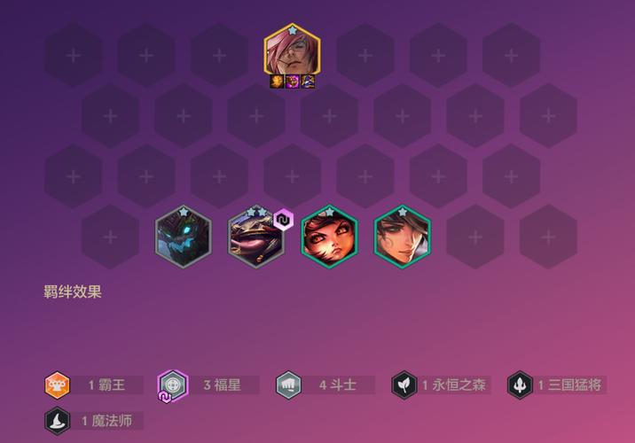 霸王:瑟提作为天选英雄,具备独特的霸王羁绊,提供额外的战斗能力。1枭雄:虽然不是主要羁绊,但如有条件可搭配,增强整体实力。8斗士:斗士羁绊提供高额的生命值和攻击力加成,是阵容的主要输出和坦度来源。3永恒之森:增加阵容的魔法抗性和回复能力,提升整体生存能力。