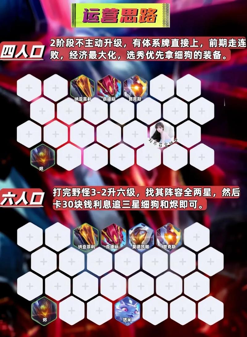在拉人口方面,二杠一拉四,用三星苏瑞玛打连胜;八杠三拉五不站立即;三杠二拉六,上稳落手二前进;四杠一拉七,探索让卡利西递出三星洛手和卡特拉八。八人口时开出七诺克萨斯羁绊,并持续关注阵容强度,根据需要进行调整。按照以上搭配和思路,暴扣诺手阵容能够在金铲铲之战中冷门上分,实现无限连环暴扣,轻松取得胜利。