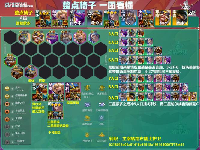 阵容组成 大嘴:作为核心输出,依赖其高频率的攻击和技能释放。布里茨(机器人):提供前排坦度和控制。刀疤:另一位前排坦克,增强阵容的抗压能力。泽丽:作为狙神,提供远程输出能力。阿木木:增加阵容的控制和坦度。魔腾、艾克:提供额外的羁绊效果和输出/控制。安蓓萨:补充阵容,增加羁绊多样性。