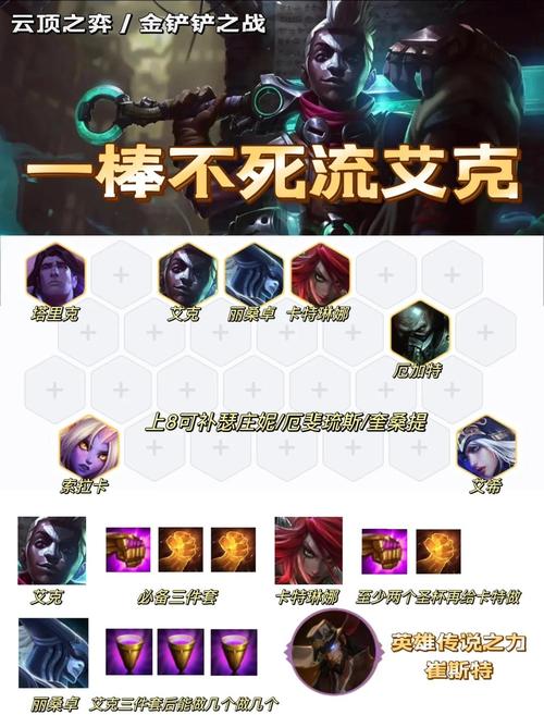 〖One〗、金铲铲之战爆杀流艾克的玩法、出装及羁绊选取如下:阵容搭配 棋子组成:布隆(4费)、卡特(2费)、老鼠(1费)、艾克(3费)、小丑(3费)、阿卡丽(5费)、男刀(2费)、机器人(2费)。羁绊组成:6刺客、3辛迪加、2保镖、2极客。这套阵容以刺客为核心,能够迅速切入敌方后排,造成大量伤害。