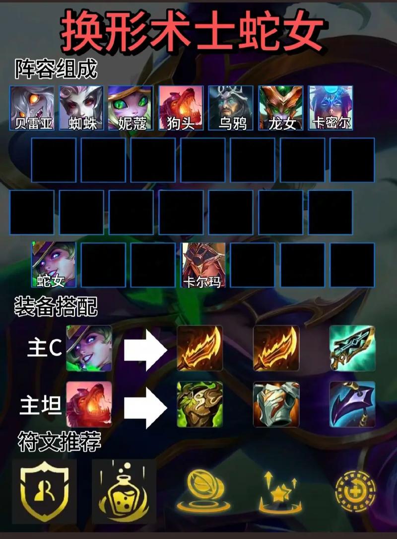 金铲铲之战玉剑摄魂莫甘娜阵容主要由以下英雄组成:风女、吸血鬼、狗头、刀妹、泰隆(男刀)、莫甘娜、慎、斯维因,以及任意新春使者。这个阵容的核心是莫甘娜,她既是输出核心也是阵容的灵魂。赛季之星选取 天选玉剑莫甘娜:如果拿到天选玉剑莫甘娜,后期新春使者可以选取玉剑羁绊,以开启6玉剑的强力效果。