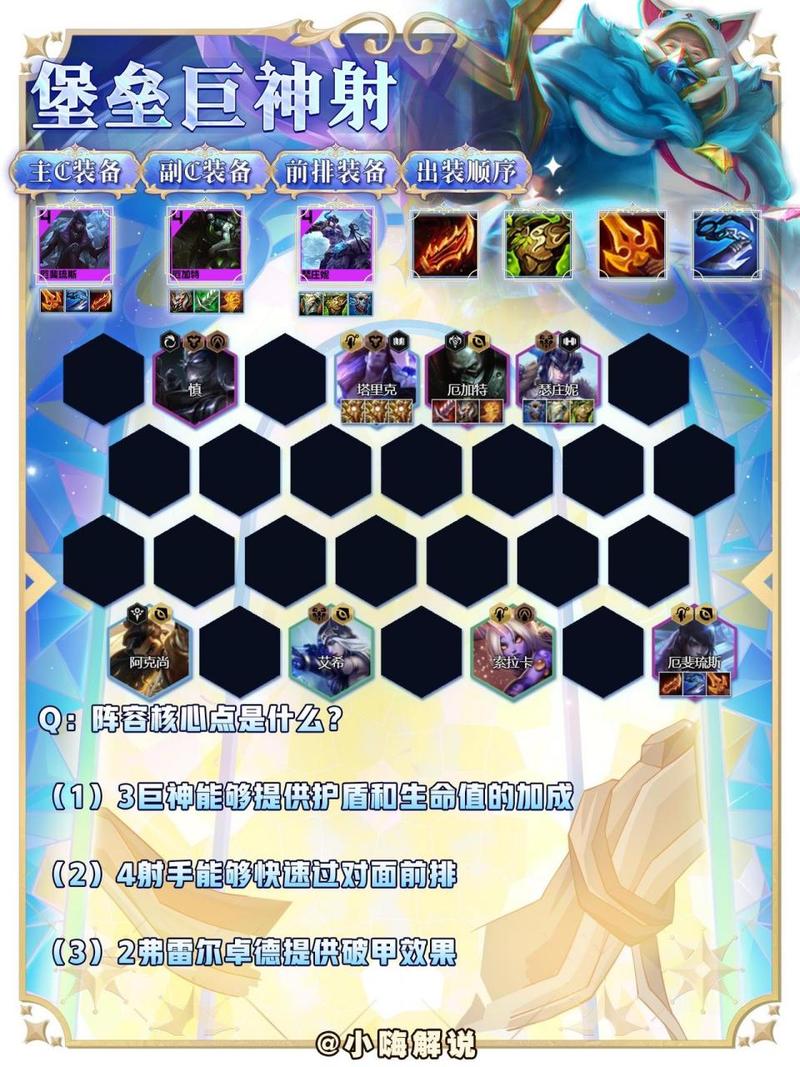 选取阵容:艾克,冰女,卡特,蔚,瑟庄妮,厄加特,大头,寒冰,这些英雄组成3皮城2祖安3弗雷尔的羁绊,以发挥各自的优势。 强化符文建议:优先考虑潘多拉的装备,组建强大的军团,争取胜利。其次,可以选取快速思考,了解敌人的动向,或者魔杖,理想主义,冒险举动,这些符文也能为你的战斗带来帮助。