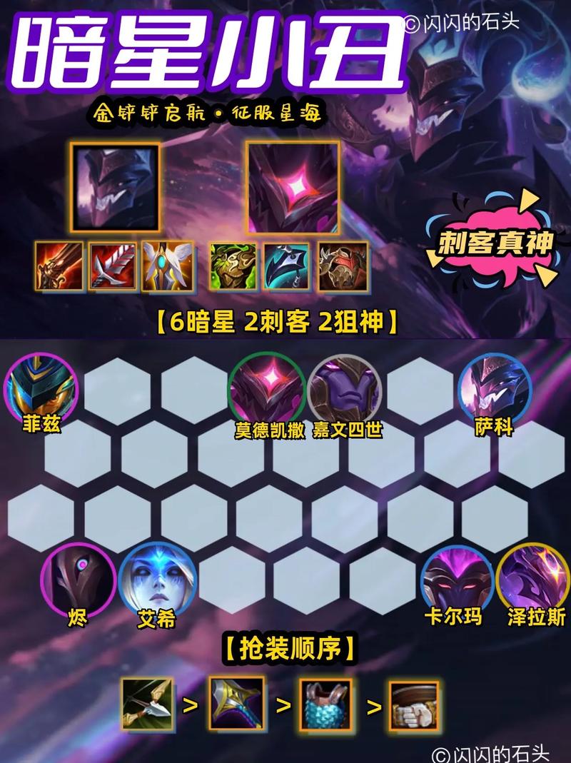 辛迪加刺客在金铲铲之战S6赛季展现出极强实力,小丑萨科为核心输出。玩家对于如何操作辛迪加刺客阵容可能感到困惑,以下内容将详述该阵容的组成、装备搭配、海克斯科技选取与运营策略。阵容由阿卡丽、艾克、萨科、卡特琳娜、婕拉、德莱厄斯、迦娜、布隆组成,涵盖5辛迪加、4刺客、2极客、2保镖、2学者羁绊。