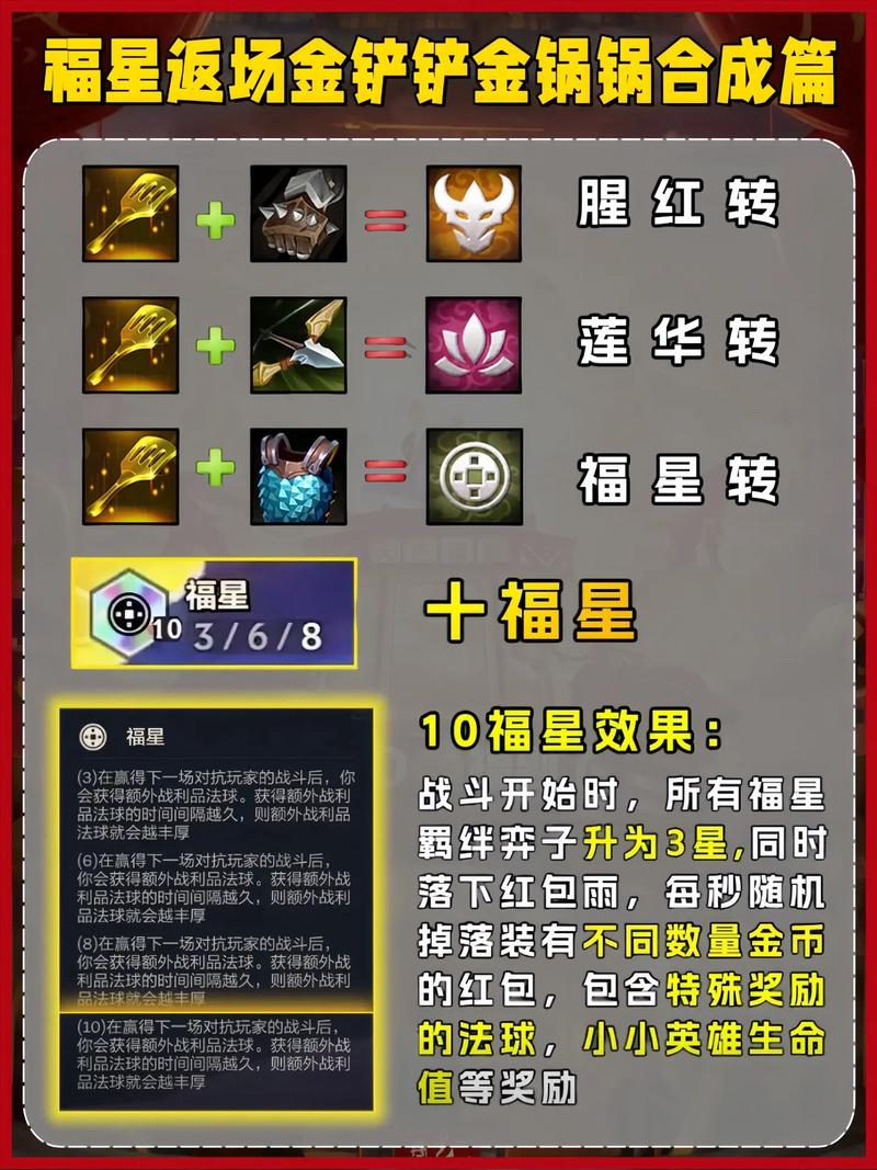 合成公式:负极斗篷 + 金铲铲 = 星神法球。只要把这俩装备放在一起,就能合成出星神法球啦!装备效果:只要英雄带上这个星神法球,那他也算是一名星神啦!星神羁绊还超有用的:- 场上有2名星神时,友军能获得20%的治疗效果。- 场上有4名星神时,友军能获得45%的治疗效果。
