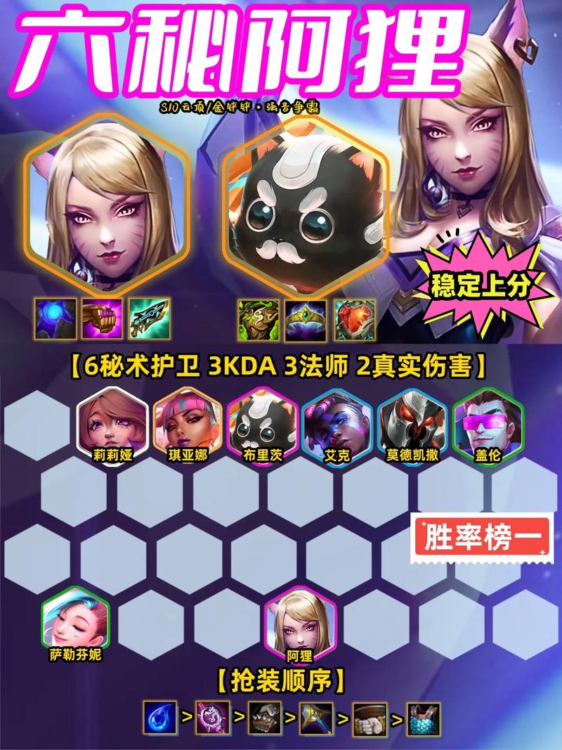 〖Four〗、《金铲铲之战》S10超级粉丝阿狸阵容玩法推荐如下:阵容组成 “超级粉丝阿狸”阵容由3KDA(阿狸、阿卡丽、莉莉娅)、3超级粉丝(阿狸、娑娜、艾克)和2护卫组成。这个阵容的核心是阿狸,利用她的技能和装备成为主要输出点。站位策略 根据KDA格子站位,阿狸作为主要输出应受到重点保护。