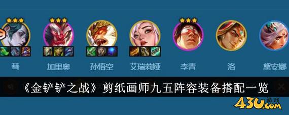〖Four〗、金铲铲之战剪纸画师九五阵容搭配如下:阵容组成 该阵容由彗(慧)、加里奥、孙悟空、艾瑞莉娅(刀妹)、李青、洛、黛安娜(画师)、迦娜、锐雯组成。羁绊选取 主要羁绊为4天龙之子、3剪纸仙灵、2圣贤、2武仙子、2决斗大师、2斗士。这些羁绊能够大幅提升阵容的整体战斗力和灵活性。