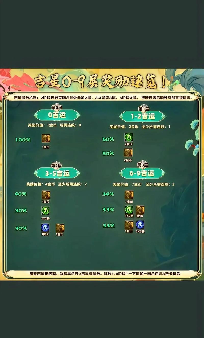 金铲铲之战s11吉星奖励内容如下:0吉运(价值1金币):奖励1金币(100%)。1吉运(价值2金币):奖励2金币(50%)或2费英雄(50%)。3吉运(价值4金币):奖励4金币(40%)、2个2费英雄(30%)或1金币加1个3费英雄(30%)。