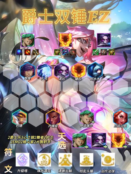 《金铲铲之战》s10爵士EZ95阵容搭配指南如下:阵容组成 核心英雄:伊泽瑞尔(EZ)、奇亚娜、俄洛伊、约里克、卢锡安、锤石、瑟提、厄运小姐(女枪)、赛娜。海克斯推荐 优选:炫目之速(提供攻速加成)、二进制空投(提供随机成装)、假人金币(通过假人获得额外金币)。