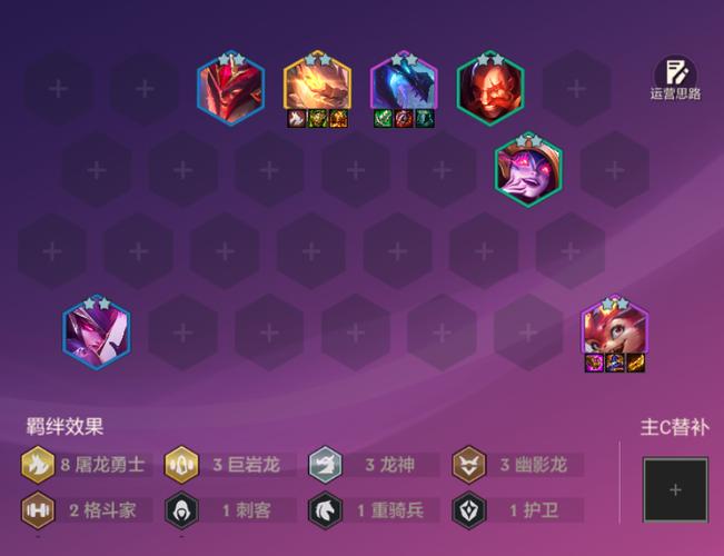 阵容组成与站位核心阵容为:霞、杰斯、希瓦娜、赫卡里姆、洛、图奇、瑟庄妮。羁绊效果:6怒翼龙、3冒险家、2迅捷射手、2换形师、2重骑兵、1龙神。