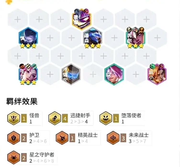 阵容组成 核心英雄:卑尔维斯、瑟提、索尔等。 其他英雄:根据实际情况选取如拉莫斯、维克兹、德莱文等英雄进行搭配,以凑齐所需的羁绊和增强阵容整体实力。阵容站位 厄加特:可作为摇摆位,有任意二星五费卡时可进行替换。 后排输出:注意站位,避免被黑客劫等英雄切入。
